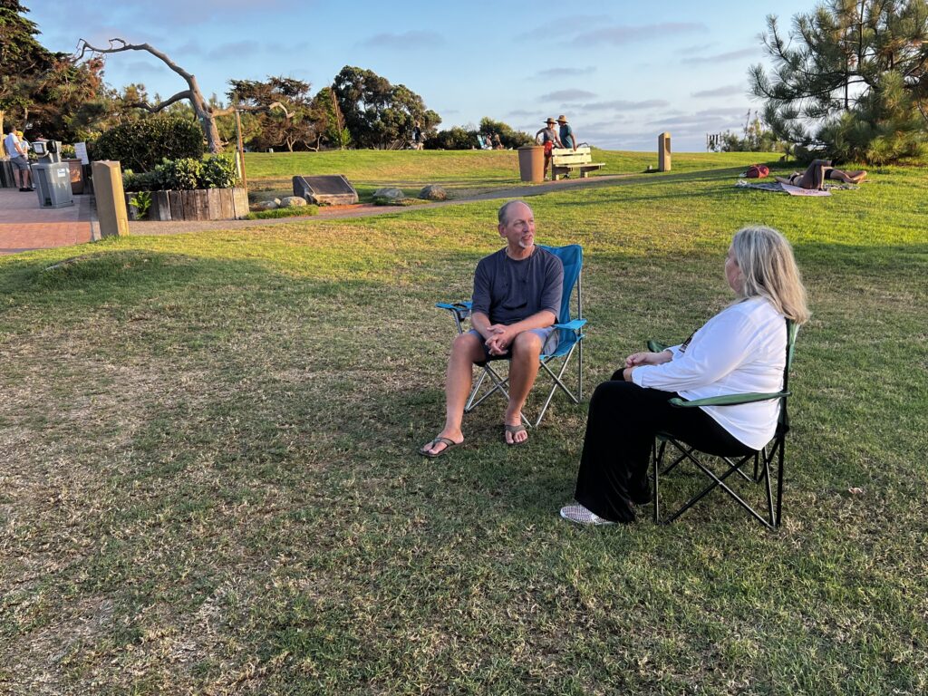 Obviously you can’t plant yourself on airport runways, in the middle of roadways, or even on sidewalks where you’re going to obstruct people. So, so far, I am generally planting myself on grassy areas just off sidewalks or paths, often in or on the fringes of parks. These need to be trafficked public areas for a number of reasons. First and most obvious, the point is to be seen by lots of people, so ideally you have access to places where people are regularly flowing by on foot. Second, you want to be in such places because you want people to feel as comfortable interacting with you as possible. I think that when people know there will be other people around them in this context, they are more likely to be comfortable engaging with you, someone they do not know. Ideally it is a spot that is not so loud that it is difficult to hear and be heard. I place my chairs fairly close to one another, and this has not been a problem. I’m sure there are many indoor locations where this would be great to do if one was allowed. In these Covid days, that is not something I’ve tried to arrange. But in the future, I can certainly see if it would be possible to gain entrance to, say, a mall, a transit station or airport, or some other privately owned but very publicly trafficked place. I am at a point where, while I’m going back to places I’ve listened before, I’m still looking for new places to bring it. I live in a big county, and I’m sure I will find lots of good listening spots all over the place.
