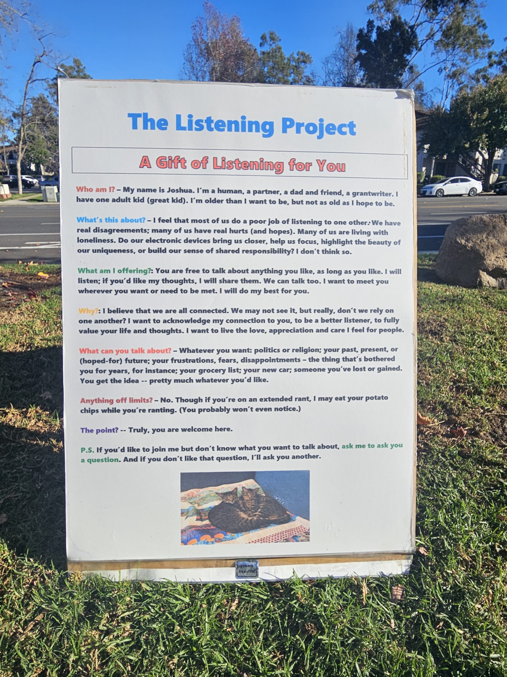 If you are here because you saw me doing this out in the world, stopped to read about the Listening Project, and took a card with the information to access this website, I am grateful for your interest in listening, and I appreciate your being here. If you are one of the people who has stopped to read my sign and then joined me to share something about your life or to discuss the project with me, I am particularly thankful for the chance to get to know you a little bit, and for your willingness to engage with me and help build this new experience. Thank you.